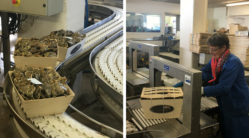 На берегу реки находится цех по сортировке и упаковке моллюсков, это позволяет сократить время на доставку, соответственно максимально сохранить свежесть. Извлеченные из воды устрицы поступают на конвейерную ленту. Каждая устрица простукивается вручную – для определения плотности мяса внутри раковины.