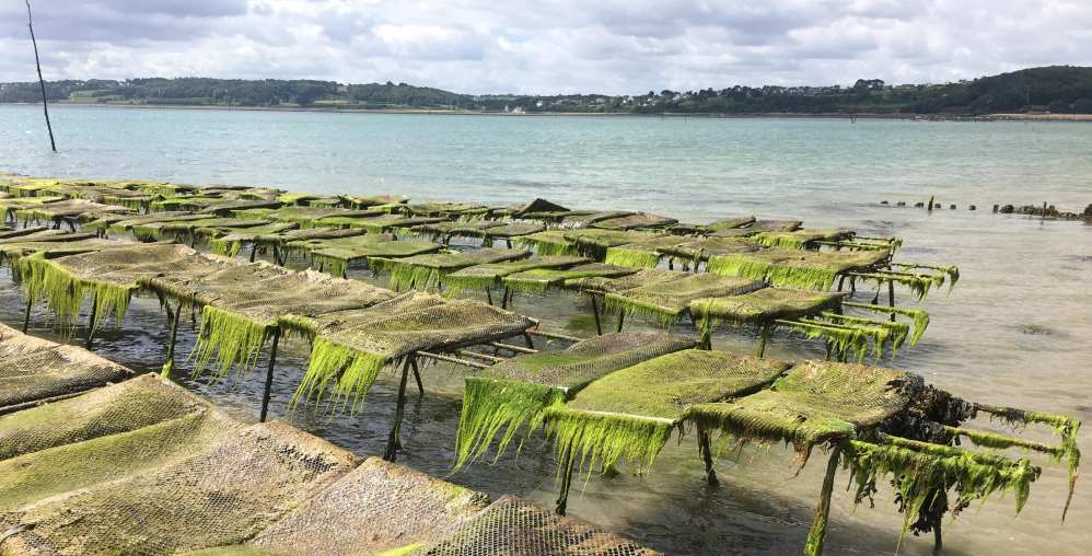 Устриц-малышей помещают в специальные сетки и кладут на так называемые столы на берегу залива CARANTEC.