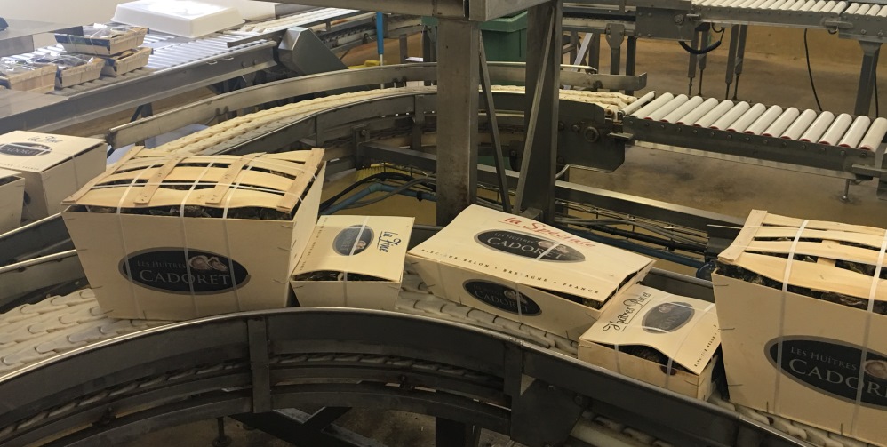 На берегу реки находится цех по сортировке и упаковке моллюсков, это позволяет сократить время на доставку, соответственно максимально сохранить свежесть. Извлеченные из воды устрицы поступают на конвейерную ленту. Каждая устрица простукивается вручную – для определения плотности мяса внутри раковины.